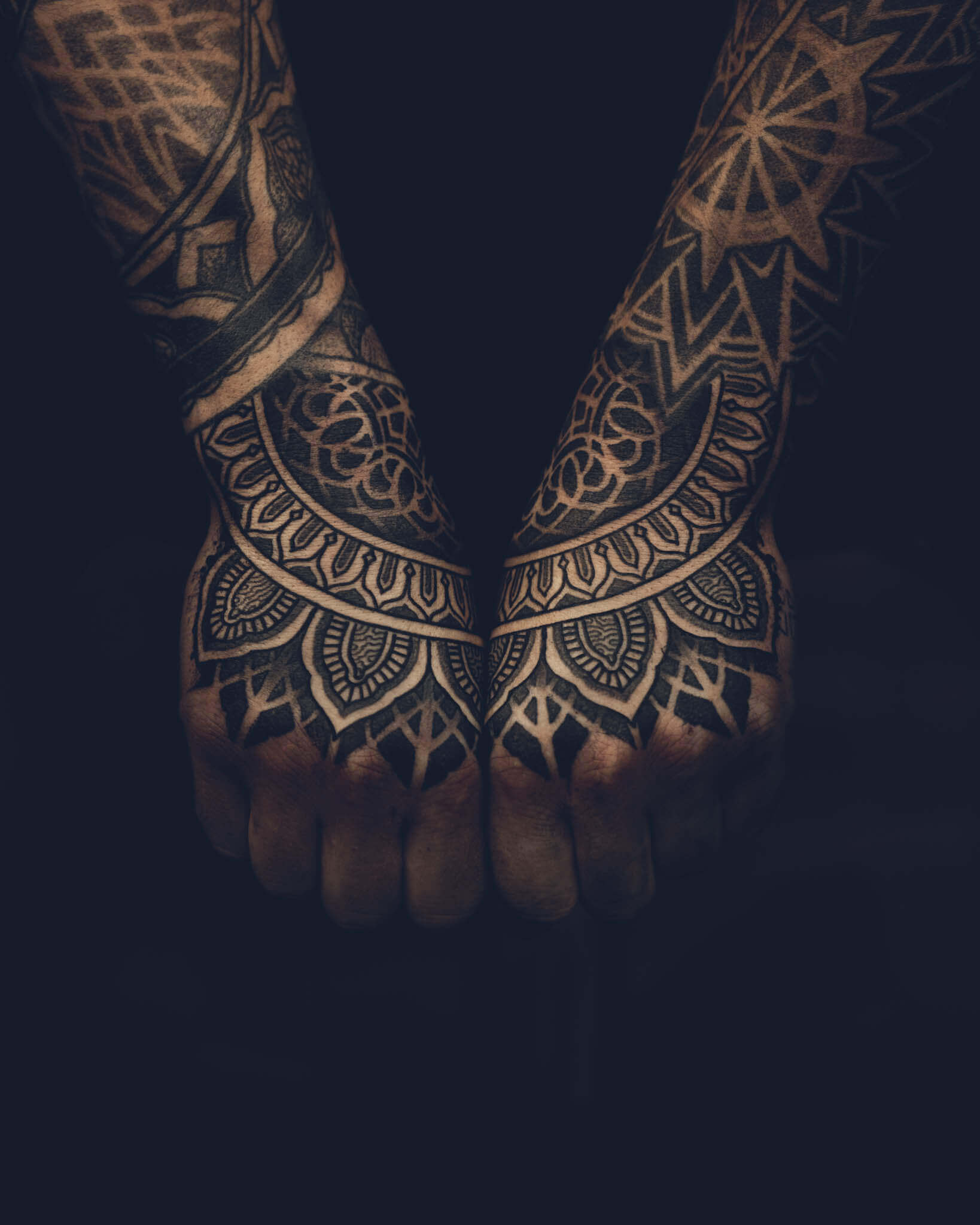 The mandala is one of the most iconic hand tattoo designs — its circular symmetry naturally complements the shape of the hand, and the symbolism of wholeness, balance, and spiritual connection resonates deeply with collectors who choose this placement. A mandala centered on the palm or covering the back of the hand is one of the most visually powerful tattoo placements in body art. Our mandala specialist George Kalodimas brings exceptional precision to this format.